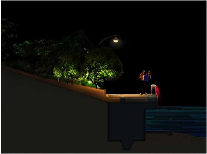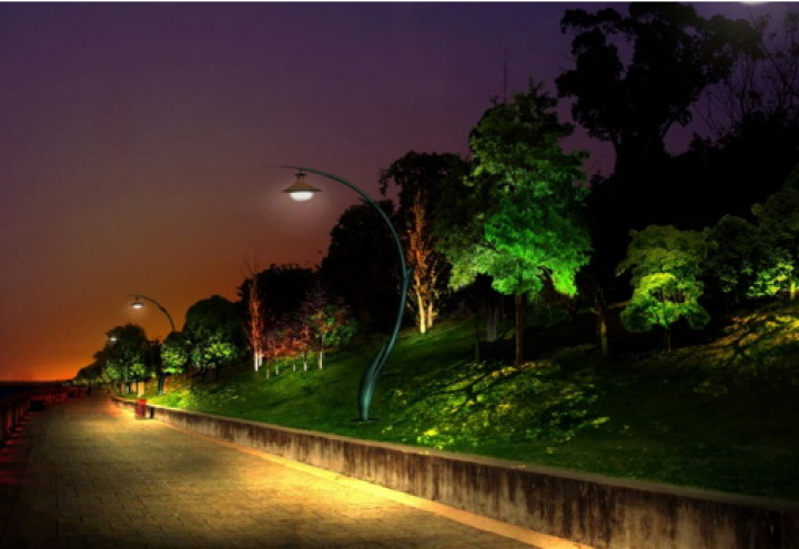 在橘子洲頭毛主席像周邊的水面上利用投影燈,將毛主席詩詞,投放在水面,打造一種唯美的意境。既可以成為一種靚麗的景觀,又符合廣場(chǎng)的主題。在其他節(jié)假日也可以通過修改投影的內(nèi)容,投放其他的元素,對(duì)橘子洲頭的景觀照明做出一個(gè)大的提升。在焰火廣場(chǎng)的的位置安裝“水幕電影”,通過以水幕為畫布,以燈光為畫筆的形式在水幕上訴說著長(zhǎng)沙的歷史文化,水幕成為人們了解人文歷史的藝術(shù)媒介,同時(shí)又可通過安裝激光、探照燈再結(jié)合音響,利用聲光電的配合上演水幕激光秀,從而達(dá)到有景可賞的目的。傅家洲目前還沒有任何照明,我們建議傅家洲的照明須與橘子洲的光色亮度統(tǒng)一起來,如此方能形成一個(gè)整體。照明手法表現(xiàn)也是將環(huán)洲的臨江界面綠化打亮,來表現(xiàn)傅家洲的夜景輪廓以及東西兩岸看過來的夜景視覺效果。